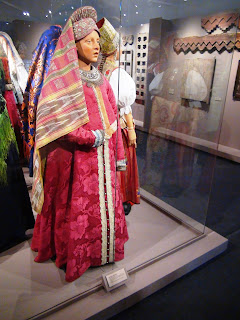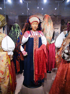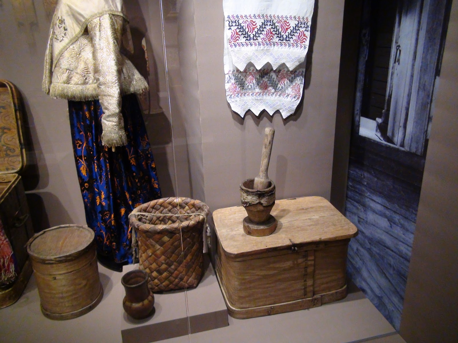 Первый зал как бы встречает нас перед домом. Манекены в женских и девичьих нарядах стоят в хороводе. На стенах наличники, двери, замки.